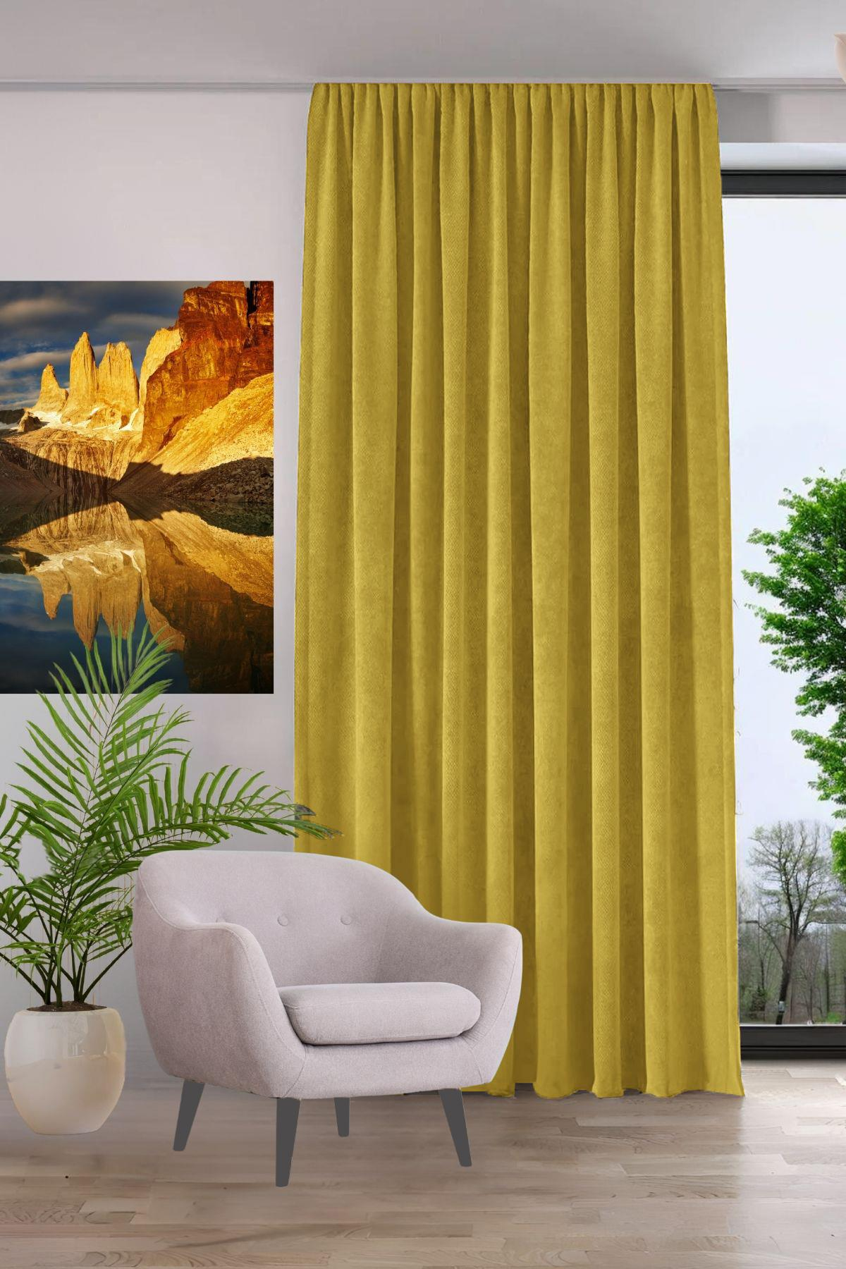 Kadife Dokulu Fon Perde Pilesiz Tek Kanat Sarı