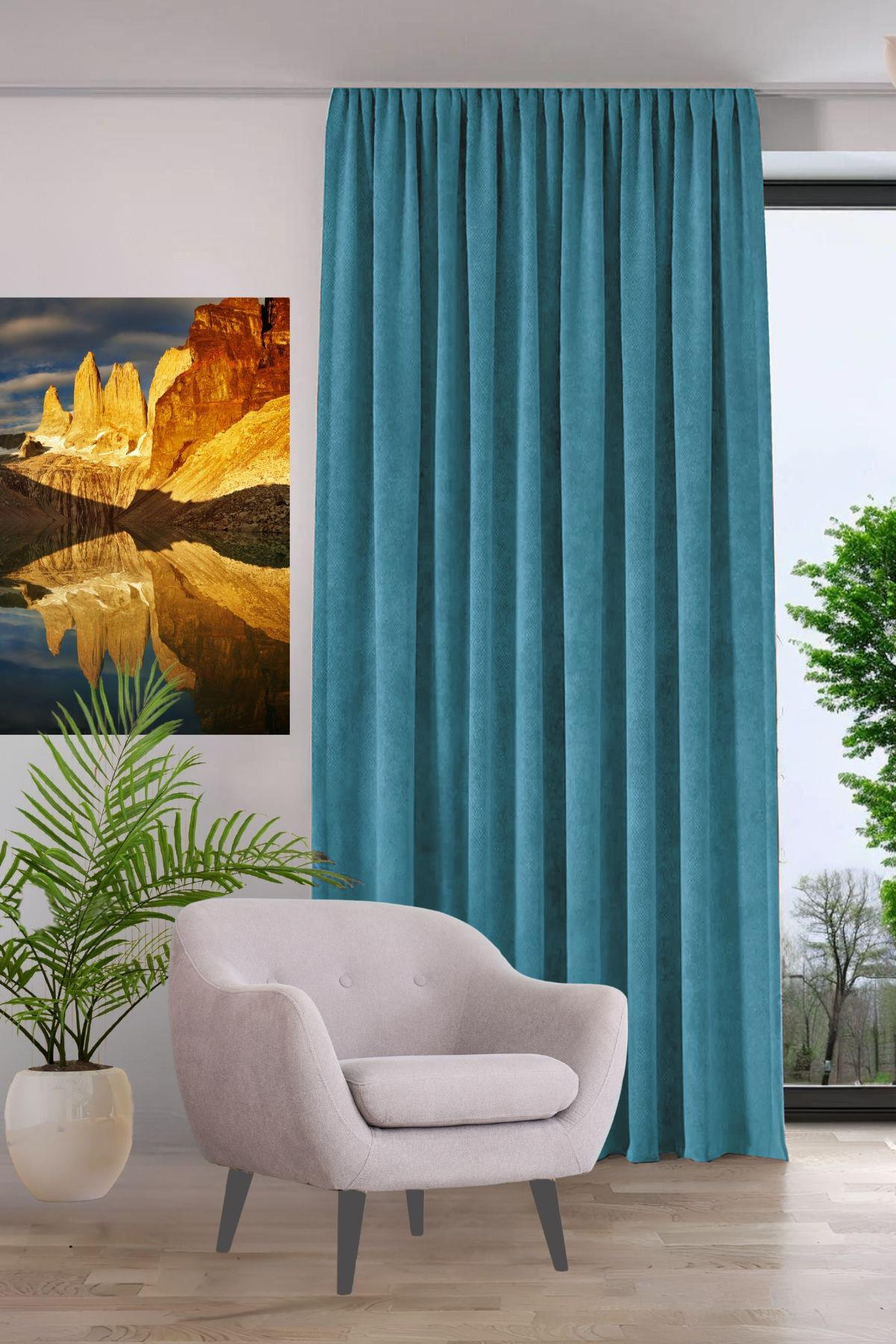 Kadife Dokulu Fon Perde Pilesiz Tek Kanat Turkuaz